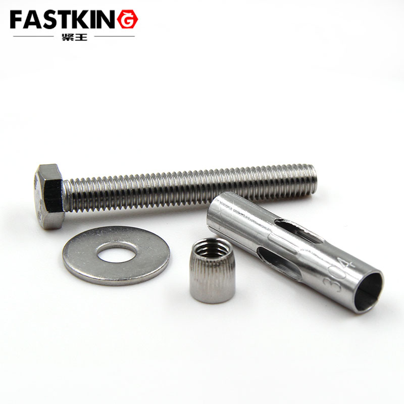 选型方面需综合考虑三大因素:一是载荷需求,根据支架及上部设备的总重量,结合基础面材质,通过力学公式计算所需膨胀螺丝的规格(如承载 100kg 的光伏支架,在 C30 混凝土上可选用 M8 膨胀螺丝,每支架至少配备 4 颗);二是环境条件,户外或潮湿环境优先选择不锈钢材质,酸碱环境需选用 316 不锈钢或特氟龙涂层膨胀螺丝,干燥室内环境可选用碳钢镀锌款以控制成本;三是安装空间,若支架底部空间狭小,可选用 “短款膨胀螺丝”,其膨胀管长度缩短但膨胀力不变,适合紧凑安装场景。