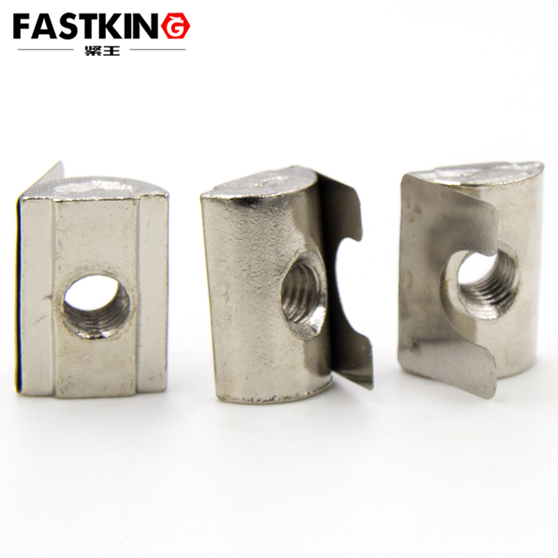 From the perspective of structural design, the core advantage of the T-profile spring nut lies in its "integrated elastic structure". Its main body is usually made of high-strength galvanized steel or stainless steel, which ensures load-bearing capacity and corrosion resistance. The top is equipped with a threaded connection hole that can be adapted to bolts of different specifications; the bottom is innovatively designed with two symmetrical elastic springs, and the ends of the springs are provided with small barbs. This structure can perfectly fit the notch of the T-profile — no pre-drilling or welding is required during installation. It is only necessary to push the spring nut into the specified position along the notch of the T-profile, and the elastic springs will be tightly clamped inside the notch under the action of their own tension, forming a stable positioning. This not only prevents the displacement of components during the installation process but also greatly simplifies the operation procedure.