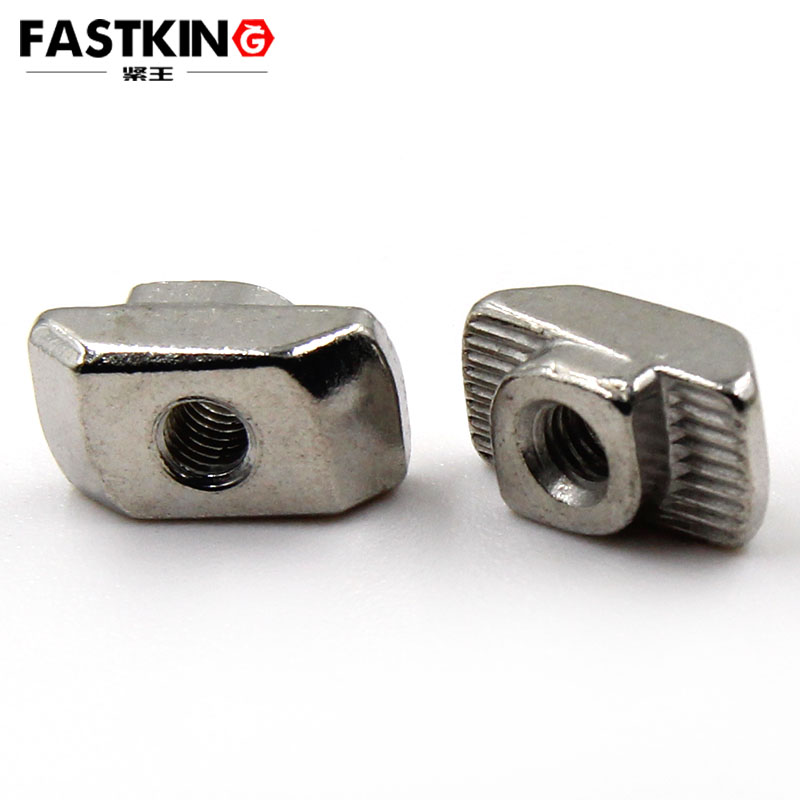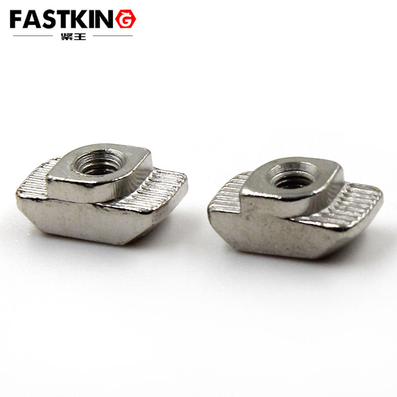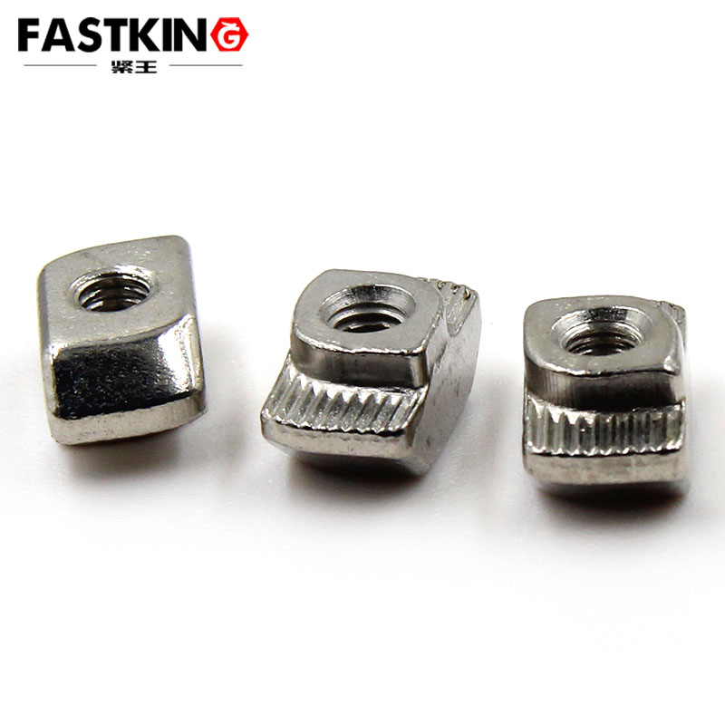 The core advantages of fixed T-nuts for aluminum profiles are concentrated in three characteristics: "no processing required", "high compatibility", and "strong stability". Firstly, the advantage of "no processing required": when connecting traditional aluminum profiles with ordinary nuts, it is necessary to first drill holes and tap internal threads on the profiles, which is not only time-consuming and labor-intensive but also may cause hole position deviation due to processing errors, affecting assembly accuracy; however, T-nuts can be directly embedded into the prefabricated T-slots without any additional processing on the aluminum profiles. This not only protects the integrity of the aluminum profiles but also shortens the assembly cycle, making them particularly suitable for large-scale frame construction scenarios. Secondly, the "high compatibility" feature: the specifications of T-slots for aluminum profiles on the market have formed industry standards (such as the common 20-series, 30-series, and 40-series aluminum profiles, which correspond to T-slots of different widths). T-nuts are also launched with matching specifications, ranging from M3 to M12 in thread size and from regular thickness to ultra-thin versions, which can accurately match different types of aluminum profiles and meet diverse connection needs. Finally, the "strong stability" performance: after the T-nut is embedded in the T-slot, the radial clamping force generated when the bolt is tightened firmly locks the nut head in the slot. Even when subjected to lateral tension or vibration loads, it is not prone to displacement; some T-nuts are also designed with anti-slip patterns on the head or made of elastic materials to further enhance the friction with the slot wall, avoiding loosening caused by vibration after long-term use and ensuring the stability of the frame structure.